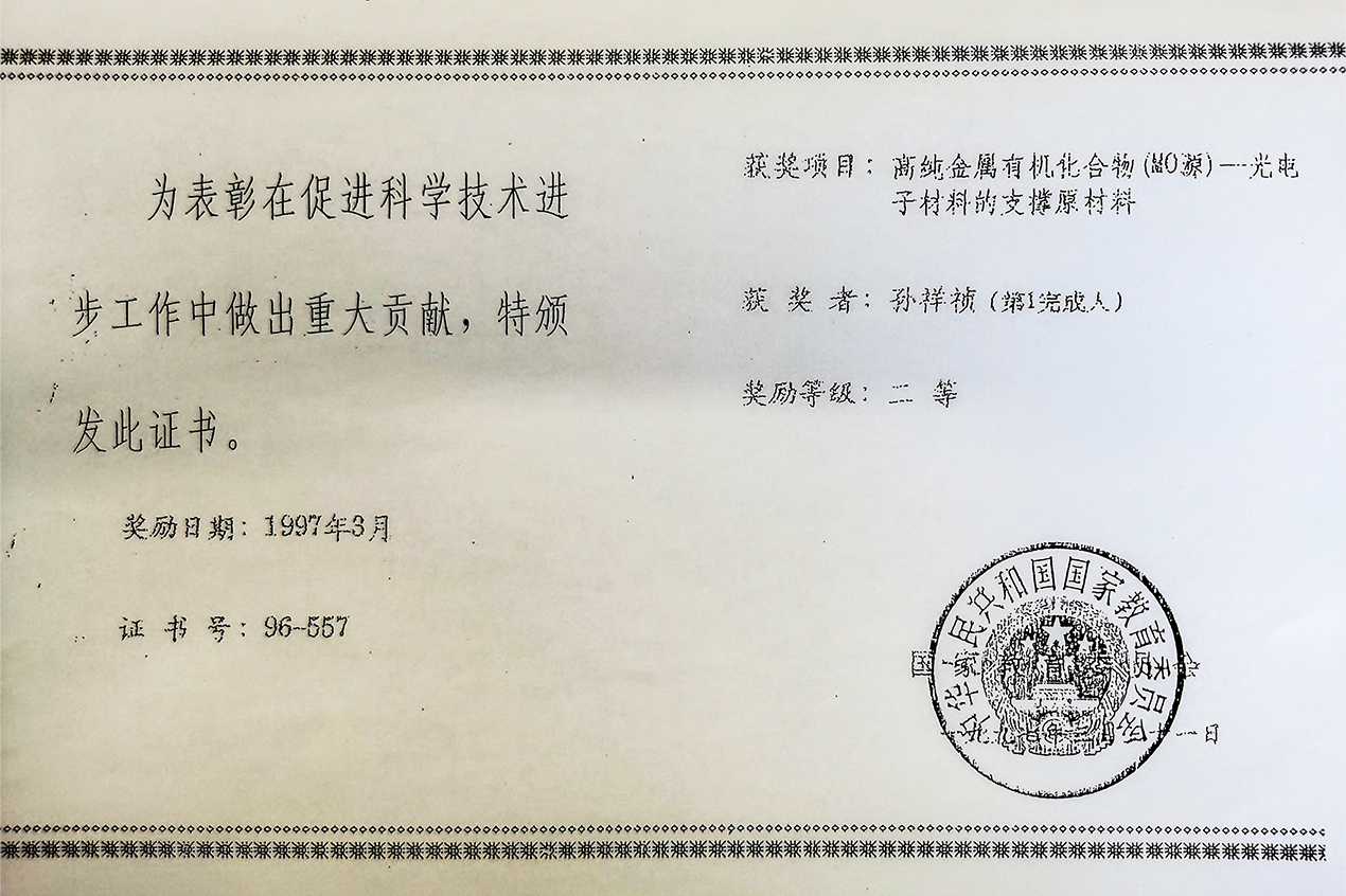 “高純金屬有機化合物(MO源)光電子材料的支撐原材料”課題獲國家教委“科 技進步二等獎”。