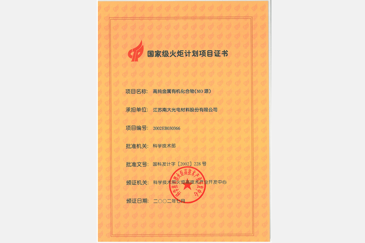 高純金屬有機化合物(MO源)獲得科技部頒發的“國家級火炬計劃項目證書”。