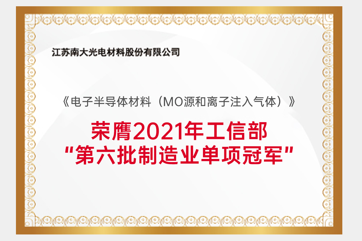 南大光電《電子半導體材料(MO源和離子注入氣體)》榮膺2021年 工信部“第六批制造業單項冠軍”。